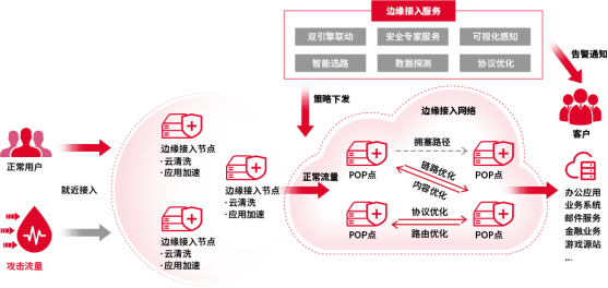 基于AccessOne边缘接入服务,用户可实现业务透明转发,并构建网络层安全防护,无惧DDoS攻/击。