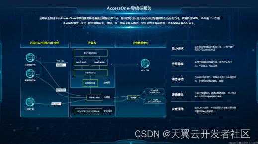 为了在不可信网络中构建信任的安全系统, AccessOne推出零信任服务,基于零信任安全理念和架构,依托天翼云边缘节点,以身份认证与动态评估为基础,打造全新的企业安全远程访问能力,提供更安全、便捷、统一的接入服务。通过零信任控制面服务,天翼云助力客户有效进行统一管控、策略下发,实现身份可信、设备可信和行为可信;通过零信任数据面服务,天翼云可为客户提供包括智能选路、解除安全威胁的全方位保障。