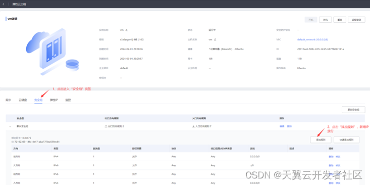 在云主机列表中点击云主机名称,进入云主机详情页。点击“安全组”页签,点击“添加规则”按钮,新增IP放行。
