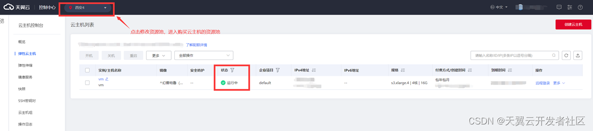 支付成功后返回云主机控制台,选择订购云主机所在的资源池。云主机状态变更为“运行中”后即为开通成功,可以进行后续操作。