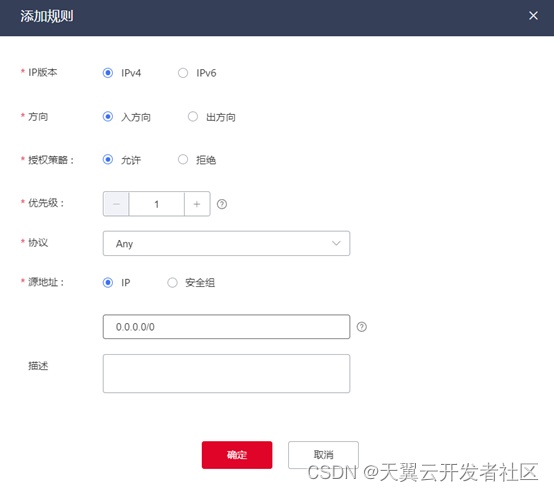 在添加规则弹窗中,根据需要选择IPv4或者IPv6,方向选择“入方向”,授权策略选择“允许”,协议建议选择“Any”,源地址0.0.0.0/0为开放所有IP。