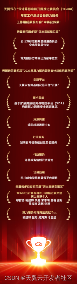 近日,云计算标准和开源推进委员会(TC608)年度工作总结会暨算力服务工作组成果发布会在北京召开。会上,天翼云斩获2023年算力服务领航者计划优秀案例等多项大奖,天翼云算力分发网络平台“息壤”通过了可信算力调度服务能力认证。凭借领先的产品技术和丰富的落地实践,天翼云深度赋能千行百业高质量发展,获得业界权威认可。
