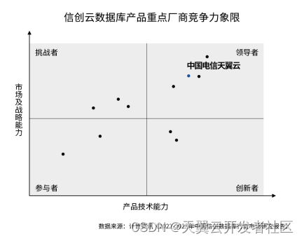 1月9日,计世资讯(CCW Research)发布《2022-2023年中国信创数据库行业市场研究报告》(以下简称“报告”),从产品技术能力和市场及战略能力两个维度对我国主要数据库产品服务商进行竞争力分析。其中,中国电信天翼云凭借其产品丰富的管理功能、灵活的部署架构,位列云数据库产品领域领导者象限。