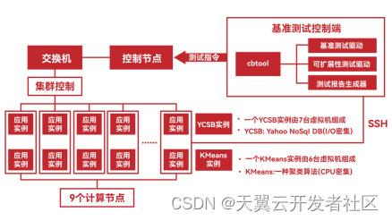 SPEC Cloud IaaS 2018 Benchmark是SPEC开发的基于大数据场景下的云基准标准测试套件,用以衡量云计算的性能,Benchmark基准测试模型主要测试的是IaaS云平台性能。SPEC Cloud IaaS 2018通过创建NoSQL(Cassandra)实例实现YCSB架构,其测试项包括吞吐量、插入响应时间、读取响应时间、平均应用实例(Application Instance)配置时间。SPEC Cloud IaaS 2018基准测试使用HiBench KMeans实现计算密集型测试,测试项包括完成时间、每个应用实例运行的Hadoop迭代计数、平均应用实例配置时间。