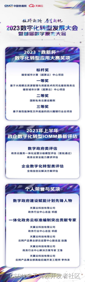 9月13日-14日,由中国信息通信研究院、中国通信标准化协会联合主办的2023数字化转型发展大会暨首届数字原生大会在京举办。大会公布了第二届“鼎新杯”数字化转型应用大赛获奖案例,天翼云斩获五项大奖,顺利通过三项“2023年上半年政企数字化转型IOMM最新评估”,技术实力与实践成果再获权威认可。凭借在一体化政务云、数字政府建设方面的突出贡献,天翼云多位专家获评一体化政务云标准编制突出贡献专家、数字政府建设赋能计划先锋人物。