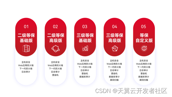 天翼云基于多年等级保护建设经验,为企业提供五种等保套餐。套餐分为固定套餐及自定义套餐两大类,其中固定套餐分为二级等保基础版、二级等保高级版、三级等保基础版以及三级等保高级版,用户只需选择资产数量即可实现原子能力快速开通。有特定原子能力需求的客户则可以选择等保自定义版,仅需勾选自己需要的原子能力,便可快速开通安全等保服务。