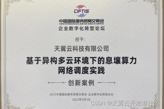 9月2日至6日,2023年中国国际服务贸易交易会在北京举办。会上,天翼云“基于异构多云环境下的息壤算力网络调度实践”荣获2023年度“数智影响力”数字化转型创新案例;“基于天翼云 4.0 分布式云底座的云骁智能计算平台实践”和“基于异构多云环境下的息壤算力网络调度实践”获评“智赋百业”2023年人工智能融合发展与安全应用典型案例。天翼云科技有限公司副总经理黄洪波出席算力服务高质量发展论坛并发表演讲,分享了天翼云如何以领先算力服务助力数字中国建设。