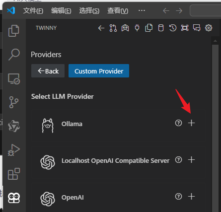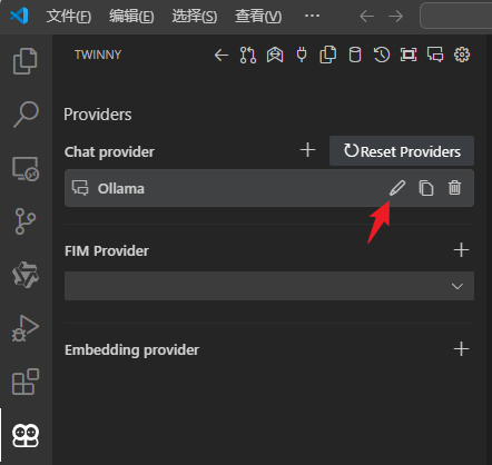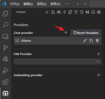 安装好后,可以直接在twinny的配置中添加接口提供者,点击上方的插头图标,twinny提供了chat,flm,embedding三类大模型的配置接口。