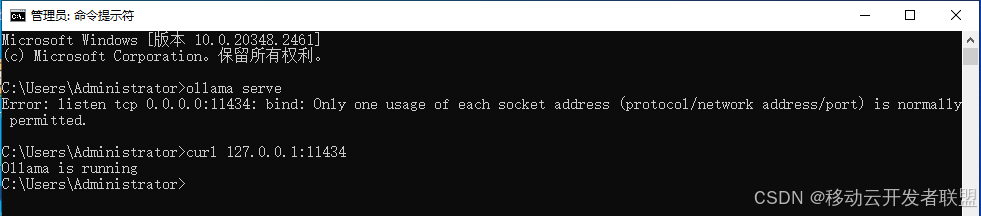 执行curl 127.0.0.1:11434 ,可以验证ollama已经在运行中