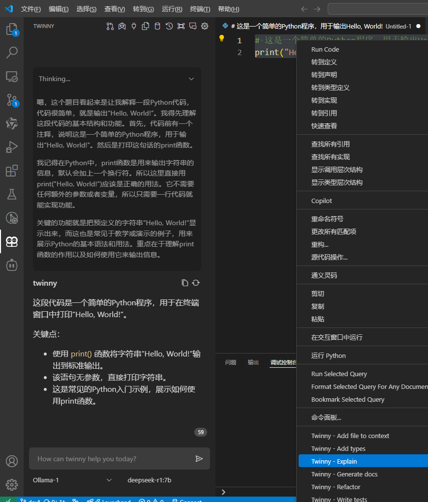 之后我们可以在vscode中选中一段代码,点击右键,选择twinny-explain,就可以看到对这段代码的解释了。