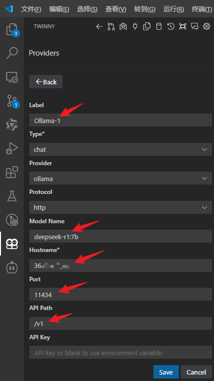 在这里我们将这个provider标记为Ollama-1,,同时填写我们云主机的公网IP和ollama的端口11434,model name填写我们在ollama中部署好的模型deepseek-r1:7b,API Path填写/v1,其余按图示进行选择即可。
