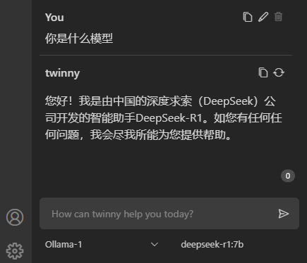 twinny的配置方式比较简单,用法也比较简洁,通过配置远程云主机上的ollama+deepseek-r1:7b,就可以不再受调用次数限制了。