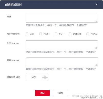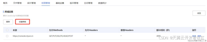 通过天翼云控制台创建的bucket,默认都会有一条允许天翼云控制台的CORS规则,点击创建策略可以新增CORS规则,如下图所示: