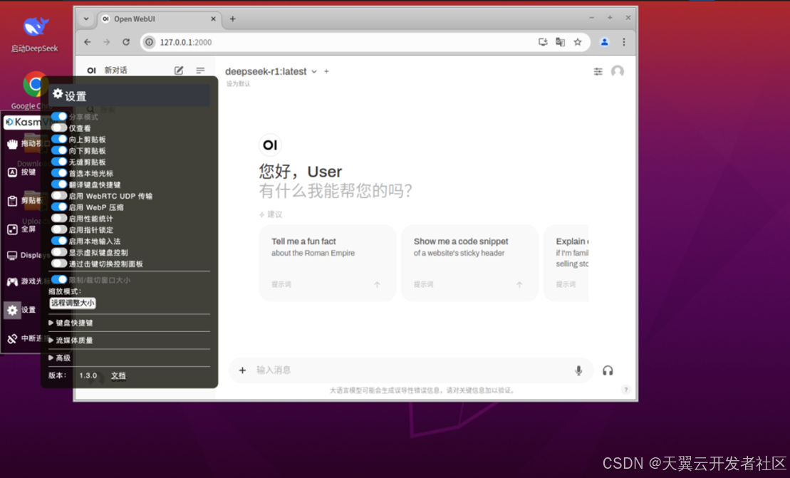 天翼云为用户配置了一个安装DeepSeek镜像且算力卡为A100的开发机,打开后是一个安装了DeepSeek应用的VNC远程桌面。用户可以在VNC桌面中选择相关配置,例如输入法等。点击DeepSeek应用,选择DeepSeek的版本,即可和DeepSeek进行对话。