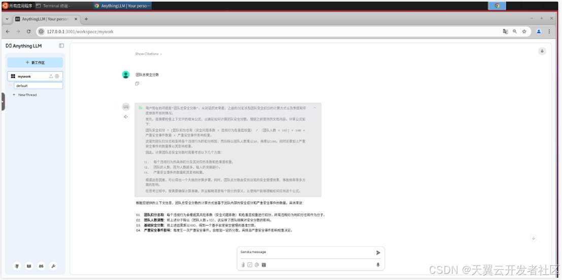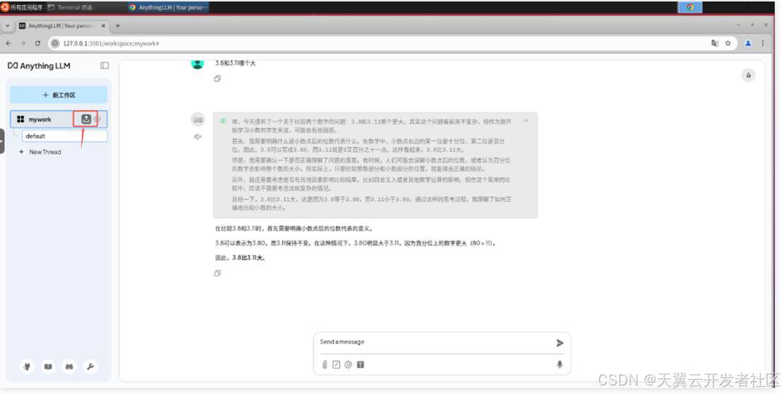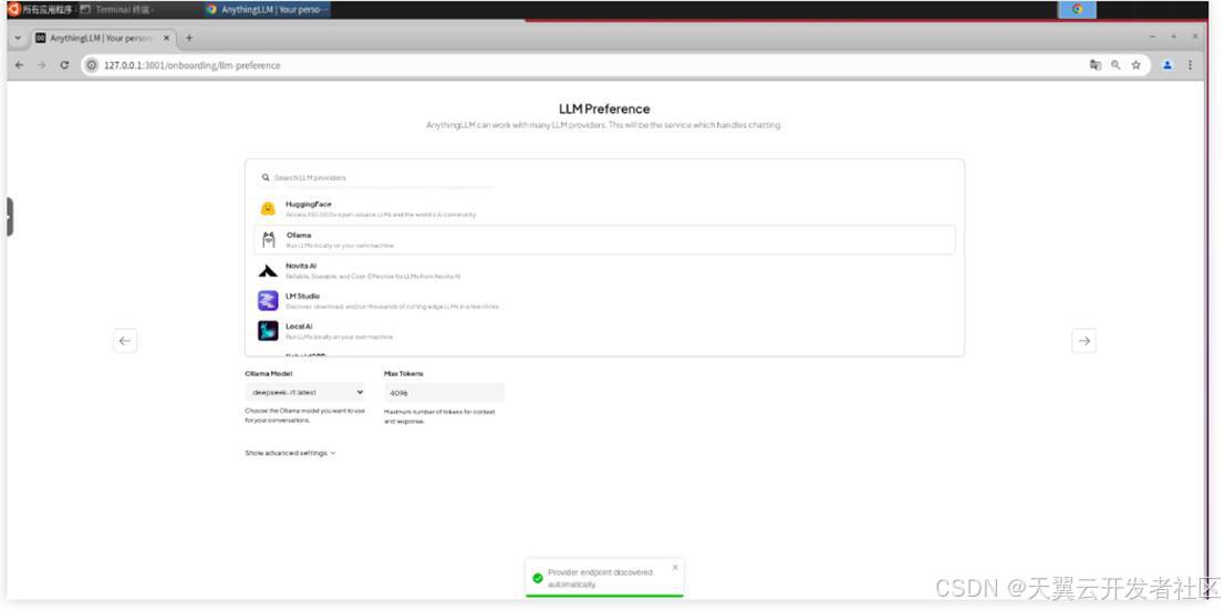 点击启动AnythingLLM图标,自动部署服务,在LLM列表中找到“Ollama”,选中后可看到Ollma Model中默认选择了DeepSeek-R1模型。创建一个工作区,在工作区中即可体验DeepSeek模型,用户可将知识库文档导入AnythingLLM中,完成知识库的查询问答。