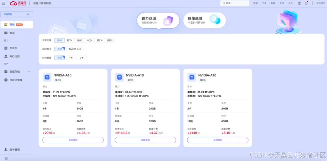 通过天翼云官网进入科研助手产品控制台,在商城中选购所需的算力资源或镜像软件。算力商城中有各个可用区丰富的算力资源和各类资源的配置,镜像商城中有各类科研领域所需的科研镜像(例如Vscode、JupterLab、DeepSeek)。另外,平台也在不断同步更新更多的镜像软件,如DeepSeek-R1推理模型、Dify模型应用开发平台或AnythingLLM模型应用开发平台,用户可按需选购。