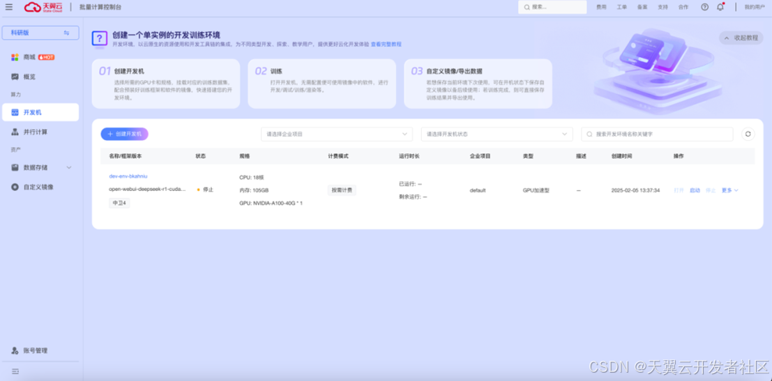 下单成功的开发机可以在开发机列表中查看,点击启动和打开按钮即可启动和使用该开发机。