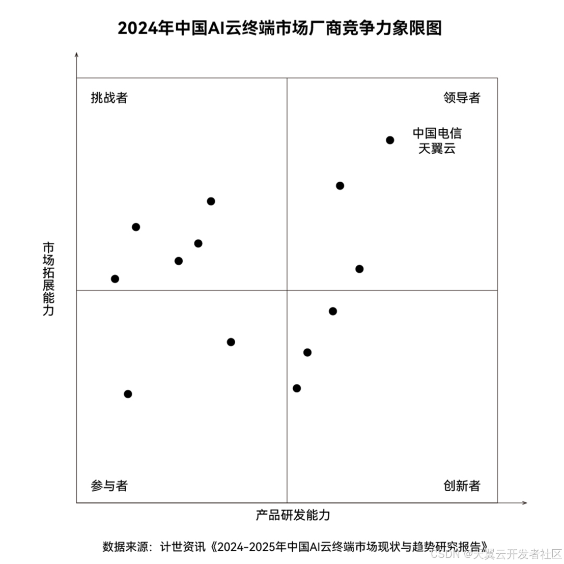 近日,计世资讯发布《2024-2025年中国AI云终端市场现状与趋势研究报告》,报告显示,中国电信天翼云凭借优秀的客户基础和领先的产品创新能力,入选2024年中国AI云终端市场厂商竞争力象限领导者域,市场拓展能力、产品研发能力均位居象限第一。