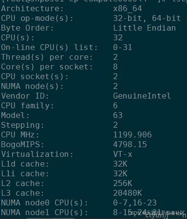 上图中机器有2个sockets,每个sockets包含1个numa node,每个numa node中有8个cores,每个cores包含2个thread,所以总的threads数量=2(sockets)×1(node)×8(cores)×2(threads)=32.