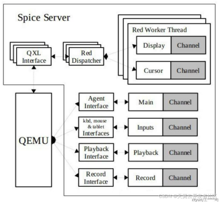 Server 通过channels 和client 通信。每一个channel 类型对应一种特定类型的数据。每一个channel 使用专用的TCP port。服务端的channel 和client 的channel 是对应的,也有Main, Inputs, Display, Cursor Playback 和Record。
