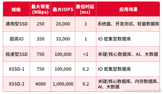 作为云服务国家队,天翼云以用户需求为导向,积极推进科技创新与产业融合,基于自研高性能分布式存储引擎LAVA,推出了百万级IOPS云硬盘XSSD,在带宽、时延、IOPS等指标方面,相较极速型SSD、超高IO云硬盘,均提升了2~10倍。云硬盘各规格指标性能如下: