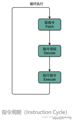 4.重复进行 1~3 的步骤。这样的步骤,其实就是一个永不停歇的“Fetch - Decode - Execute”的循环,我们把这个循环称之为指令周期(Instruction Cycle)