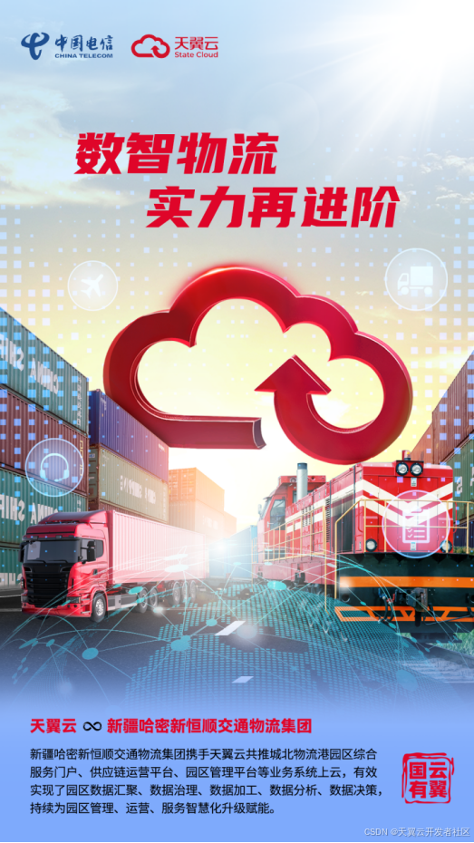 服务千家万户,连接千城百业。随着我国物流产业的快速壮大,数智技术已成为物流服务迭代升级的动力源泉。未来,天翼云也将坚持科技创新,打造更加高效便捷的物流数字化解决方案,进一步满足物流企业个性化和灵活化的需求,让物流行业焕发新活力!
