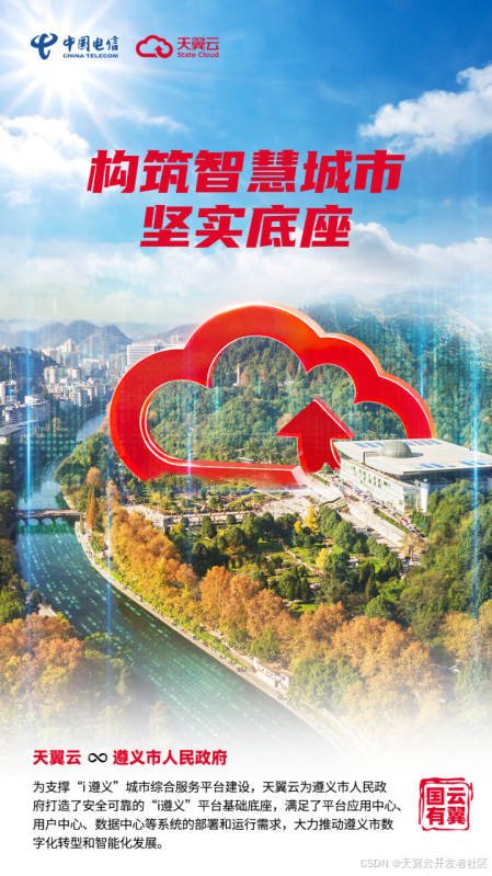 天翼云为“i遵义”量身定制一套基础资源上云解决方案,助力遵义市打造了高效统一的城市综合服务平台,赋能政务治理科学化精细化智能化发展,促进城市智慧升级。
