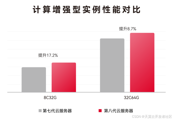 为打造更加卓越的上云体验,天翼云不断升级弹性计算服务,自研第八代升级款弹性云主机,依托天翼云自研TeleCloudOS4.0架构,实现从底层硬件到IaaS云平台的融合优化,AI场景平均性能提升超过50%,计算增强型c8e实例性能提升高达15%,相同功耗下平均性能提升超过20%,带来更高的能源效率和更低的运营成本。
