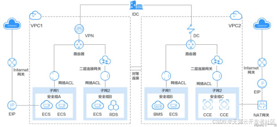 通过虚拟专用网络VPN、云专线功能将VPC和您的数据中心连通。