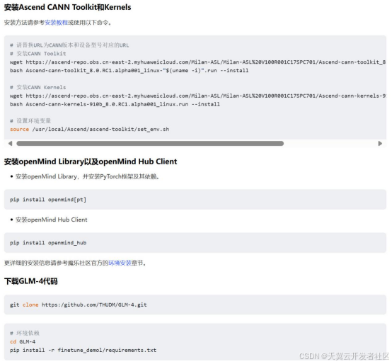 魔乐社区为开发者提供了详尽的安装教程,无论是Ascend CANN Toolkit和Kernels,还是openMind Library和openMind Hub Client,都可以通过简单的命令一键安装。这样的便捷性,让开发者可以迅速进入开发状态,无需在环境配置上耗费过多时间。如下图所示:
