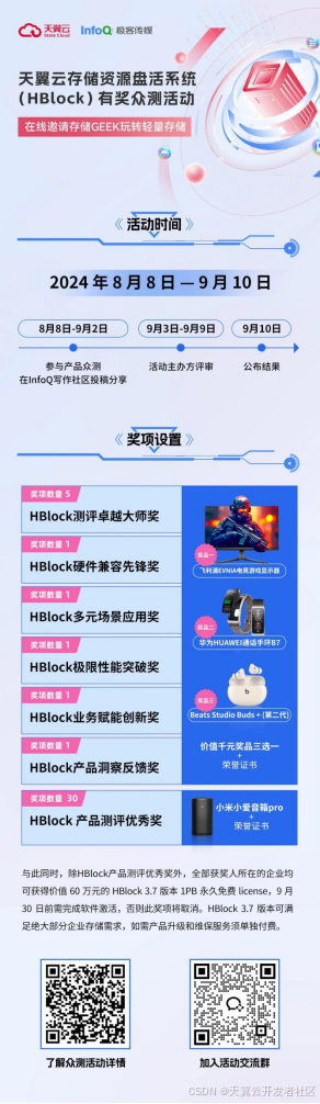 为了让“轻量存储”走进更多企业,InfoQ和天翼云联合举办“HBlock有奖众测活动”,欢迎广大存储Geek踊跃报名,深度体验轻量存储带来的不一样,将使用心得发布在InfoQ写作社区,即可参与评选并获得丰厚礼品!