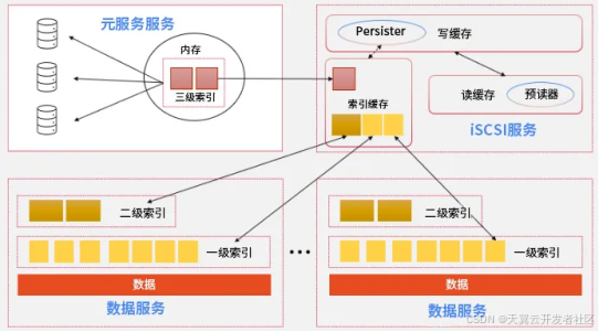 首先,HBlock设计了一级索引(记录iSCSI卷逻辑地址与数据位置)、二级索引(汇总一级索引,提高查询效率)和三级索引(记录集群内数据分布,缓存中存储,快速定位数据)的多级索引架构。其次,索引缓存机制优化了数据访问,通过逐级访问减少对元数据服务的依赖。第三,元数据持久化采用与数据相同的保护方式,确保数据和索引的容错能力。最后,HBlock支持轻量化混合部署,仅需三个节点即可完成元数据、iSCSI和数据服务的部署,充分利用硬件资源。
