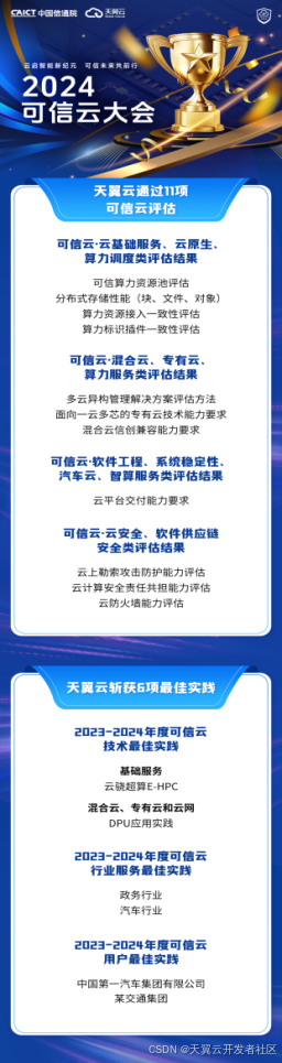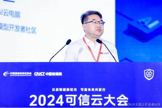 7月23日,由中国通信标准化协会主办,中国信息通信研究院(以下简称“中国信通院”)承办的2024可信云大会在北京成功召开。大会主论坛上,中国信通院携手天翼云共同发布《央国企云上数智实践指南(2024)》,天翼云科技有限公司助理总经理宫梅霞出席发布仪式;同时,天翼云还参加了《云网融合下智能算力网络应用发展白皮书——基于DPU的SRv6应用实践》《低空经济云发展研究报告》《大模型智算服务研究报告》等多个重磅仪式,通过多项可信云评估并斩获多项“最佳实践”奖。天翼云科技有限公司行业事业部总经理王晓东发表演讲,与业内伙伴共话云计算产业发展与未来趋势。