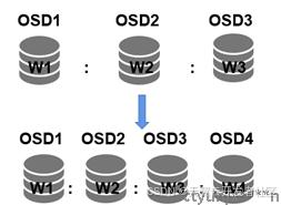 当Ceph OSD添加到Ceph存储集群时,集群映射会使用新的 OSD 进行更新。因为在CRUSH算法计算PG到OSD的映时,OSD_ID是参数之一,新加入的OSD改变了计算的输入,因此会有一部分PG根据CRUSH算法的计算原则进行迁移。下图粗略的展现了数据再均衡过程,假设之前某个PG计算出来straw值(CRUSH算法结果,PG选择OSD中最大的结果进行映射)分别为:straw1,straw2,straw3,增加OSD4之后计算,只有当straw4 > max(straw1, straw2, straw3),这种情况需要将PG数据迁移到OSD4上,会有w4/(w1+w2+w3+w4)的PG移动到osd4上(w为ODS权重),随着PG数量增多,理论上OSD上的PG分布比例为w1:w2:w3:w4。