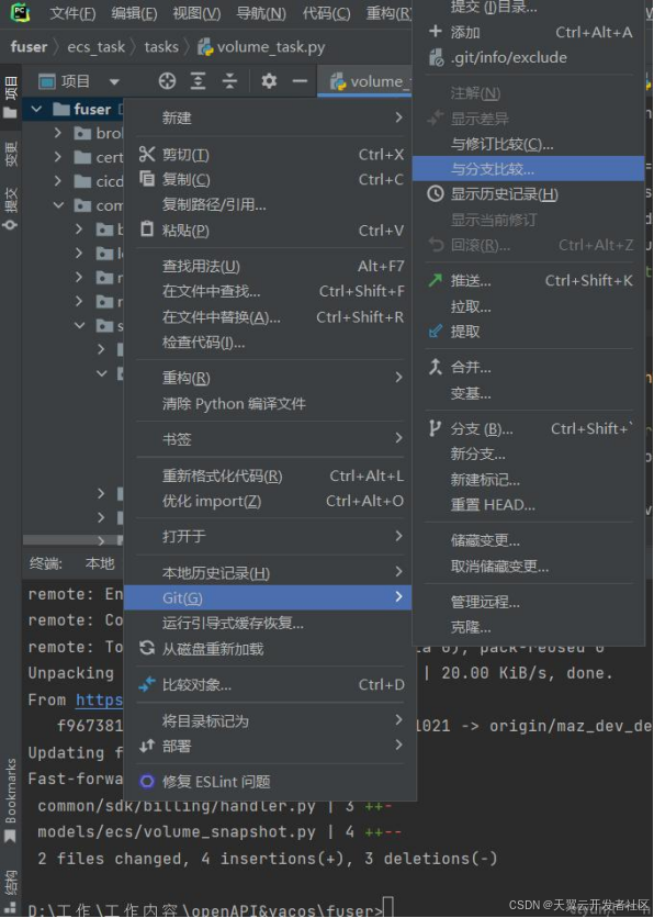 项目右键,git--与分支比较里,可以与本地的其他分支进行比较。