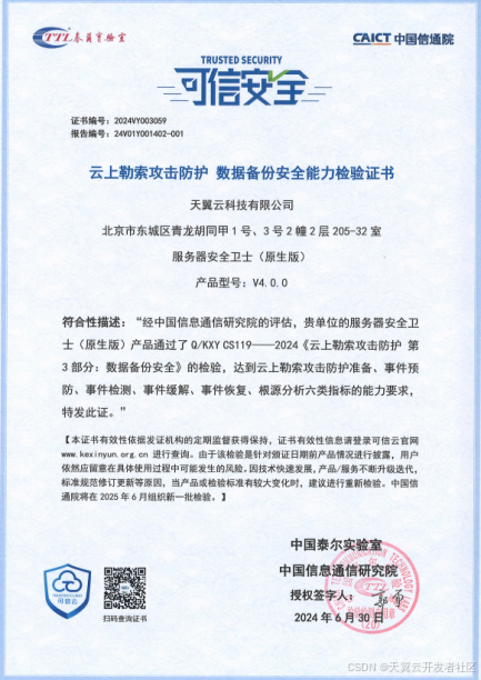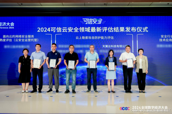 大会现场公布了“2024可信云安全领域最新评估结果”,天翼云服务器安全卫士(原生版)顺利通过中国信通院首批云上勒索攻击防护能力评估(数据备份安全能力、系统安全能力)和云计算安全责任共担能力评估。天翼云参与了中国信通院牵头开展的“网络安全保险——企业用户风险减量创新合作计划”,将与业界伙伴共推网络安全保险行业应用落地,共谋可信安全未来。此外,为鼓励对云和软件安全产业有突出贡献的优秀专家,中国信通院在会上发布了可信安全优秀个人,天翼云宋志明、吴海涛、刘刚等获得“产业创新开拓者”与“标准卓越贡献者奖项。