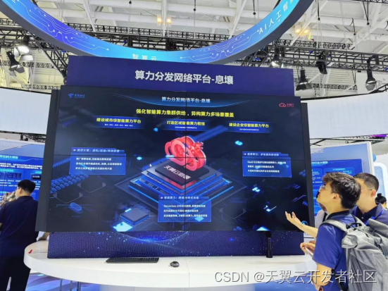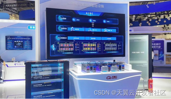 走进AI主题展区,中央矗立着一个一人高的机柜,可以看到里面的服务器和交换机在不停闪烁。这是最新研发的天翼云智算一体机,是一款针对大模型训练和推理场景,实现一体化交付、开箱即用的软硬结合云原生一体机,其通过整合预置大模型、智算平台、管理运维平台及高性能基础设施,可为企业提供适配的大模型一体化交付方案,并根据业务需求灵活拓展,极大降低了企业训练、部署大模型的门槛。
