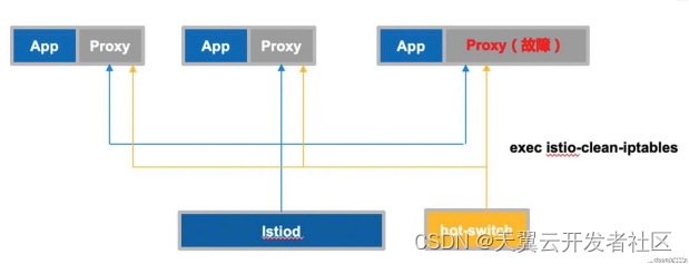 3.自动检测确认代理proxy问题后,hot-switch通过进入pod执行iptables相关命令,停止proxy的流量劫持,将流量模式由proxy控制管理,改为直通业务容器
