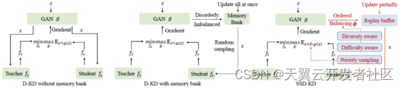 本论文提出了基于小规模逆向生成数据的零数据知识蒸馏技术(Small Scale Data-free Knowledge Distillation,下文简写为SSD-KD),引入了两个相互依赖的模块,显著加快了逆向生成数据的质量和蒸馏范式的整体训练效率。SSD-KD的第一个模块依赖于一个新颖的调制函数,定义了样本多样性分布感知项和样本难度分布感知项,以显式方式共同平衡了逆向生成数据过程中的数据样本分布。