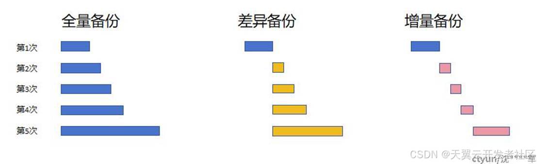 (3)增量备份 (Incremental Backup ),备份自上一次备份(包含全量备份、差异备份、增量备份)之后有变化的数据。好处是没有重复的备份数据,每次备份的数据量不大,备份所需的时间较短;缺点是数据恢复时需要历史的备份数据的关系。