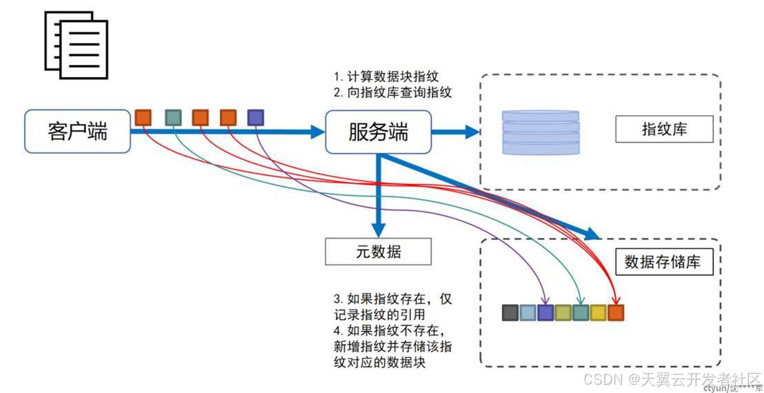 天翼云备份通过重复数据删除技术,可节省用户备份数据的存储空间占用量,降低用户的使用成本。数据处理流程:(1)将备份数据流切片;(2)计算切片数据块指纹;(3)在指纹库中比对查询;(4)仅将未重复指纹的数据块存储。