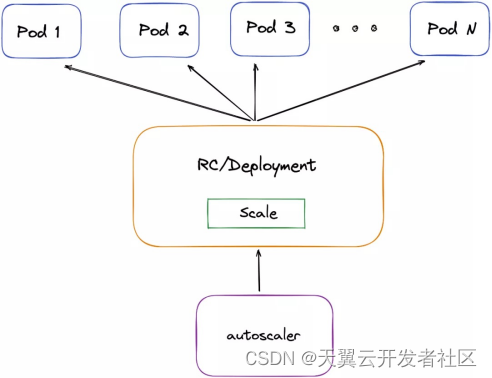 Autoscaler 根据监控到的指标(concurrency、rps、cpu等),并根据配置的指标来放大或缩小副本,从而实现自动扩缩容。