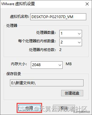 在"VMware虚拟机设置"窗口上点击"创建"按钮,创建VMware虚拟机。