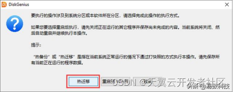 这里选择"热迁移"。DiskGenius提供两种系统迁移方式,即"热迁移"和"重启到WinPE",这里推荐选择热迁移。对系统进行热迁移,在系统正常运行的情况下就可以完成操作,并且无须关闭其他正在运行的软件等,非常方便。