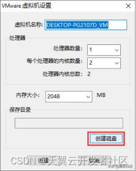 首先,需要设置虚拟机名称、处理器数量、每个处理器的内核数量以及内存大小。关于这些设置,软件根据电脑的配置给出默认的数值,对于不熟悉这些设置的用户,按照默认设置即可。然后,点击"创建磁盘"按钮,为虚拟机创建虚拟磁盘(vmdk文件)。