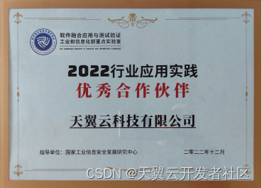 2022年12月,天翼云荣获由国家工业信息安全发展研究中心指导、软件融合应用与测试验证工业和信息化部重点实验室颁发的“行业应用实践优秀合作伙伴”授牌,意味着天翼云长期以来对实验室的支持工作得到了权威认可。