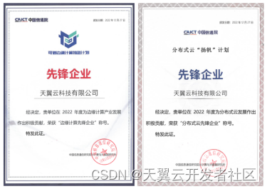 为表彰2022年度天翼云在边缘计算、分布式云领域的积极贡献,中国信通院授予天翼云“边缘计算先锋企业”“分布式云先锋企业”称号。