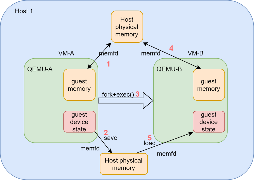 该方案修改了QEMU进程启动时为虚拟机分配内存的方式,使用memfd机制为虚拟机分配内存,并保存对应的memfd,然后在热升级时将其共享给目的虚拟机进程。