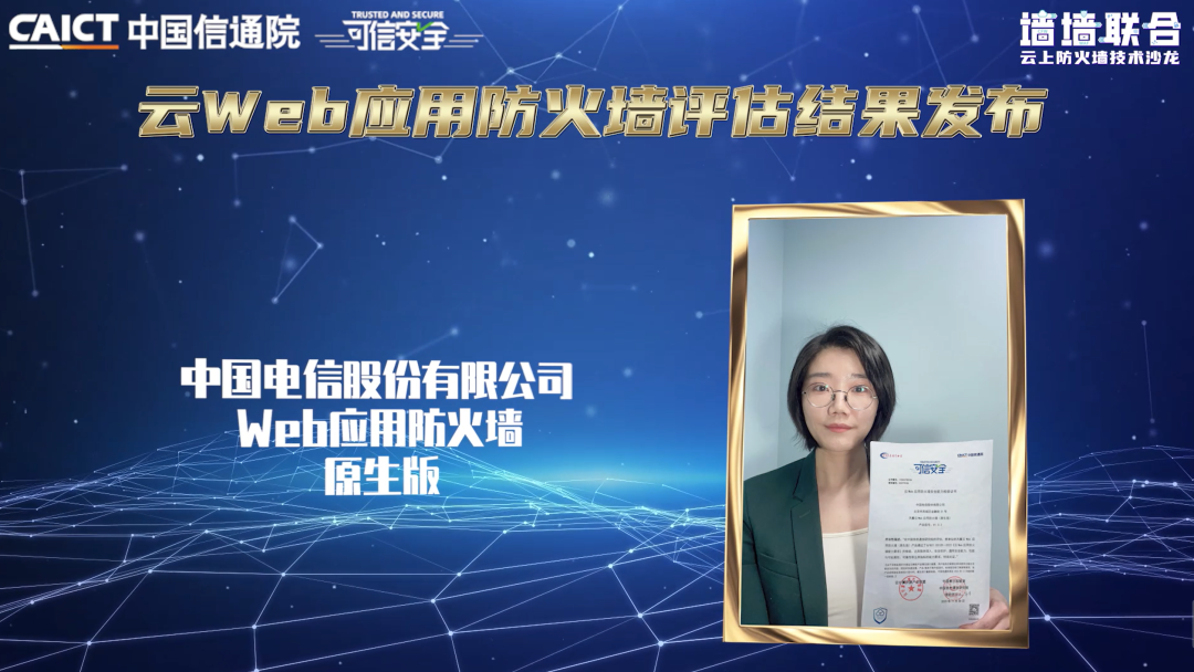12月9日,由中国信息通信研究院主办的“墙墙联合——云上防火墙技术沙龙”在线上顺利举行,天翼云科技有限公司研发专家吴雷分享了新标准、新需求下云Web应用防火墙(云WAF)的发展方向,并介绍了天翼云Web应用防火墙(原生版)的功能及特性。会上,信通院云WAF评估结果发布,天翼云Web应用防火墙(原生版)顺利通过评估,安全能力获得权威机构认可。